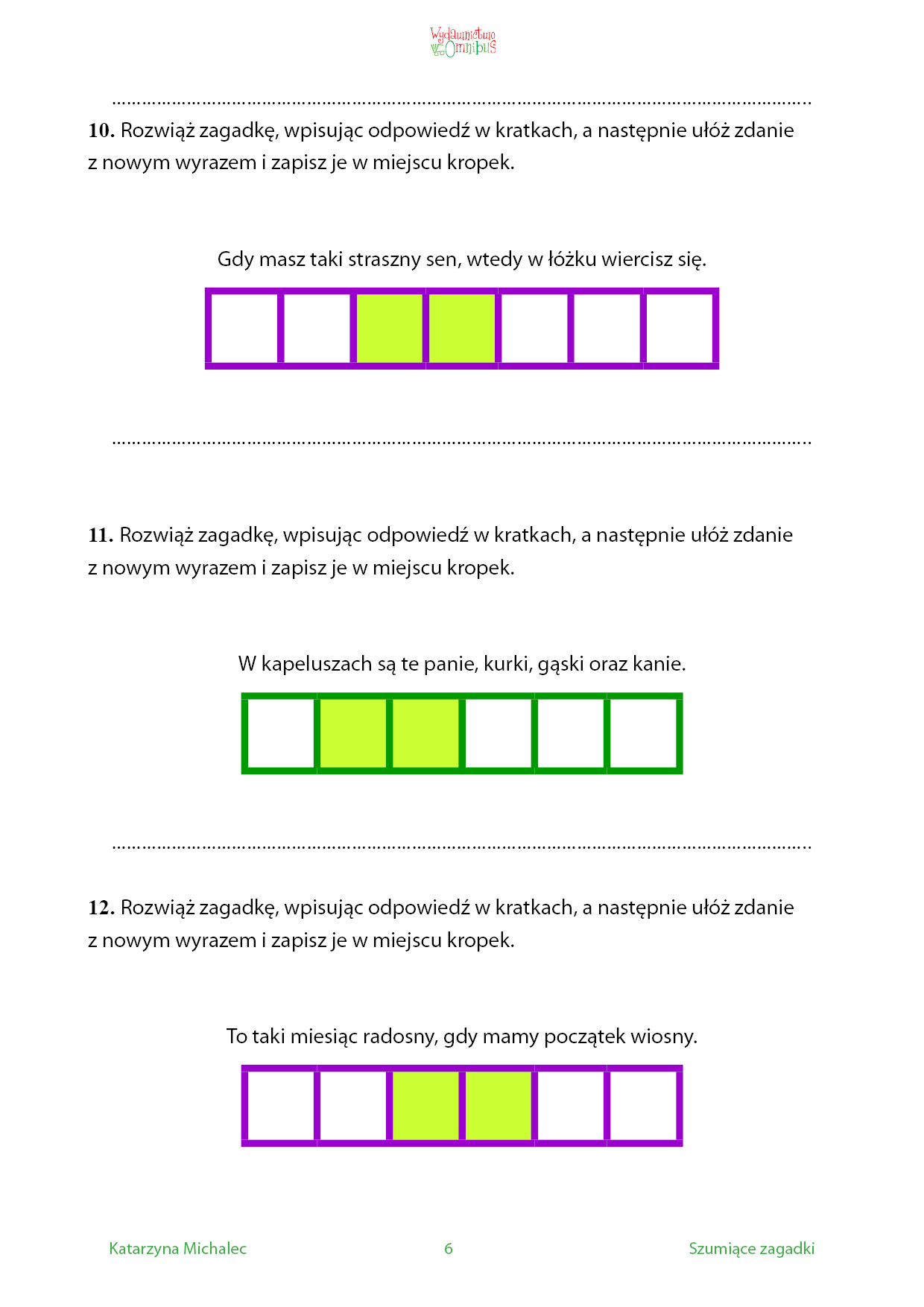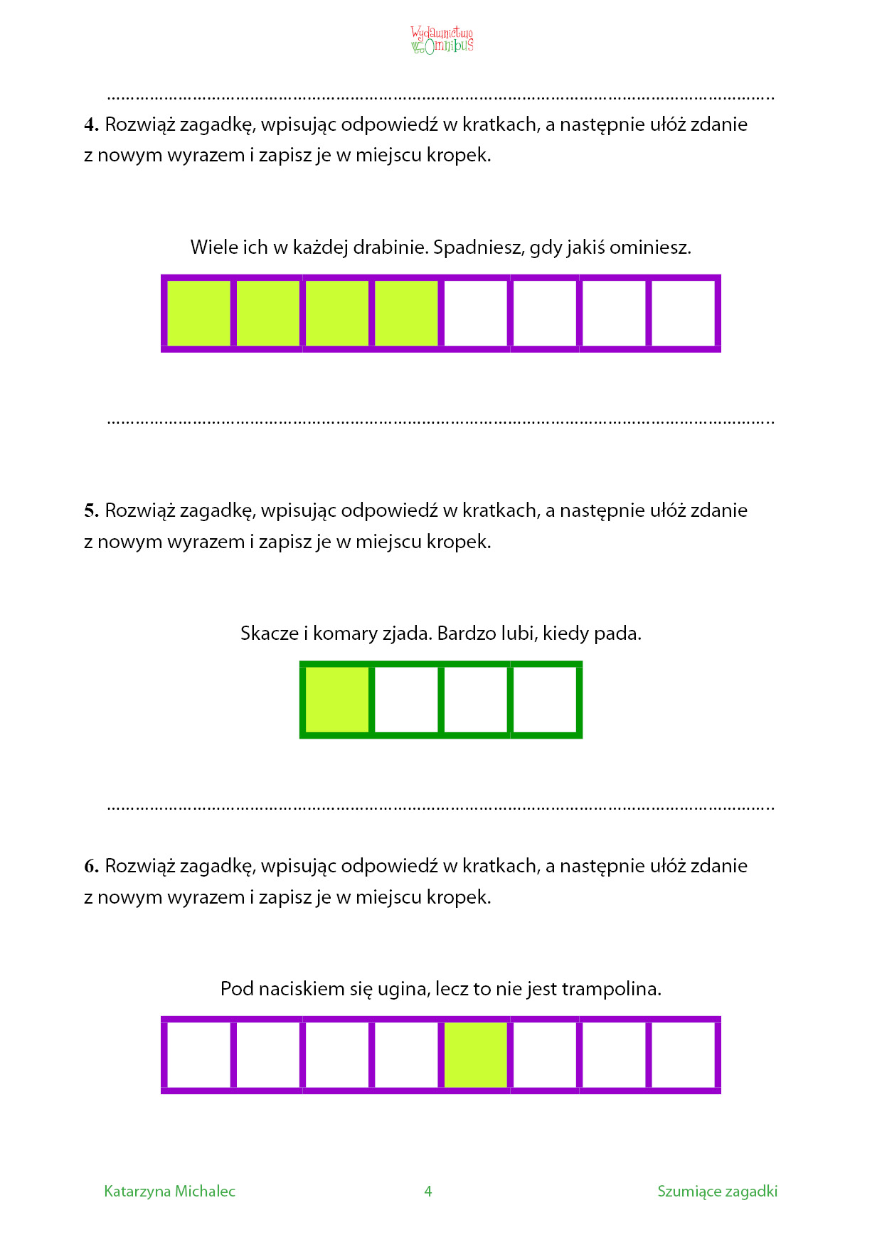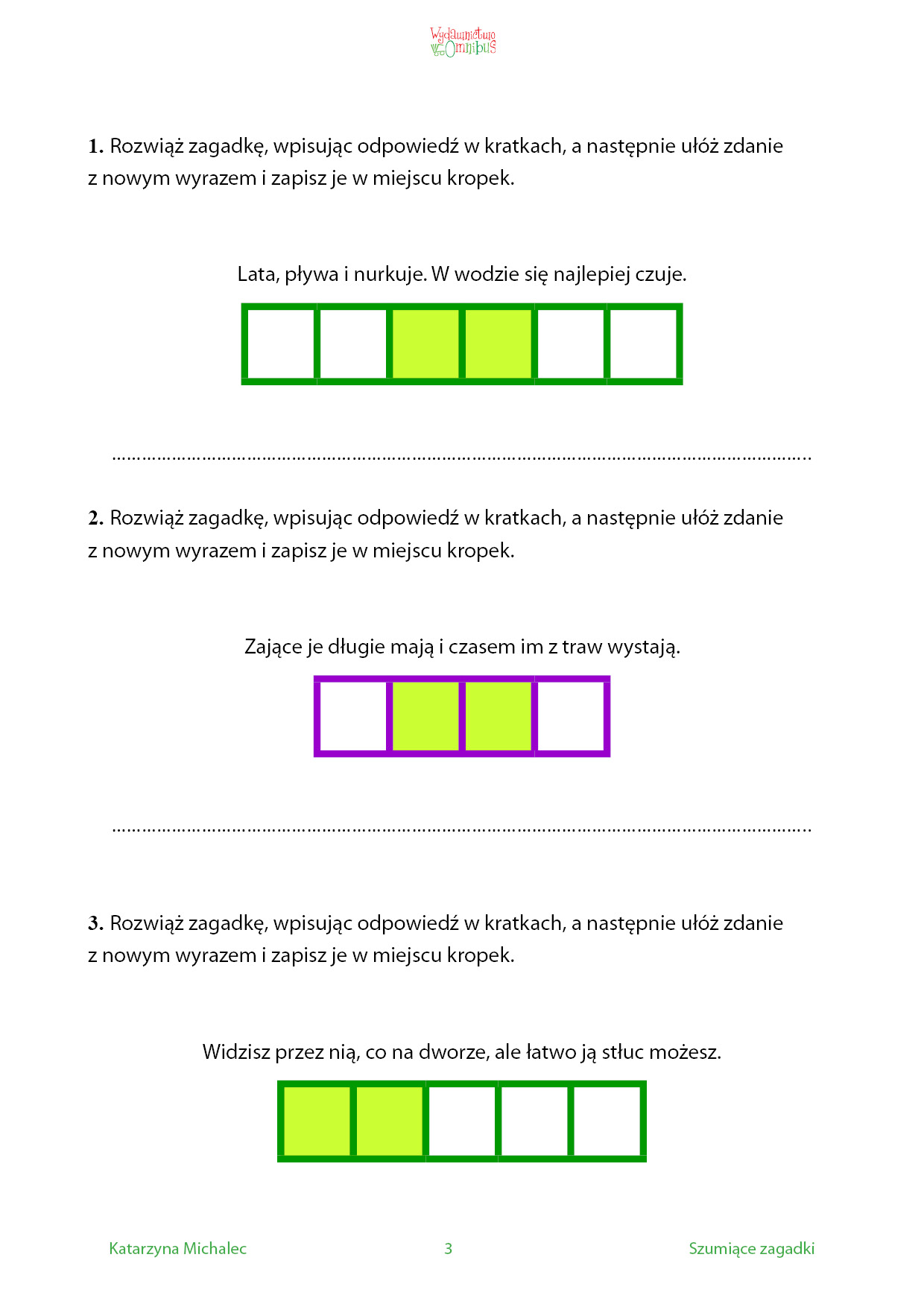 Szumiące zagadki to zbiór krótkich zagadek dla dzieci w wieku przedszkolnym i wczesnoszkolnym. Napisane są w formie rymowanki imają służyć utrwalaniu prawidłowej wymowy głosek szeregu szumiącego: sz, cz, ż, dż. Każde rozwiązanie zawiera którąś z tych głosek, a kratki zdaną głoską zaznaczone są innym kolorem. Dziecko, wpisując hasło, może je powtarzać na głos nawet kilkakrotnie, ćwicząc w ten sposób wymowę. Dodatkowe zadanie polega na ułożeniu zdania z odgadniętym wyrazem. Dzieci, które nie potrafią pisać, mogą całe ćwiczenie wykonać słownie, z pomocą opiekuna. Jeśli zagadka sprawi komuś kłopot, każde hasło można sprawdzić na końcu książki.